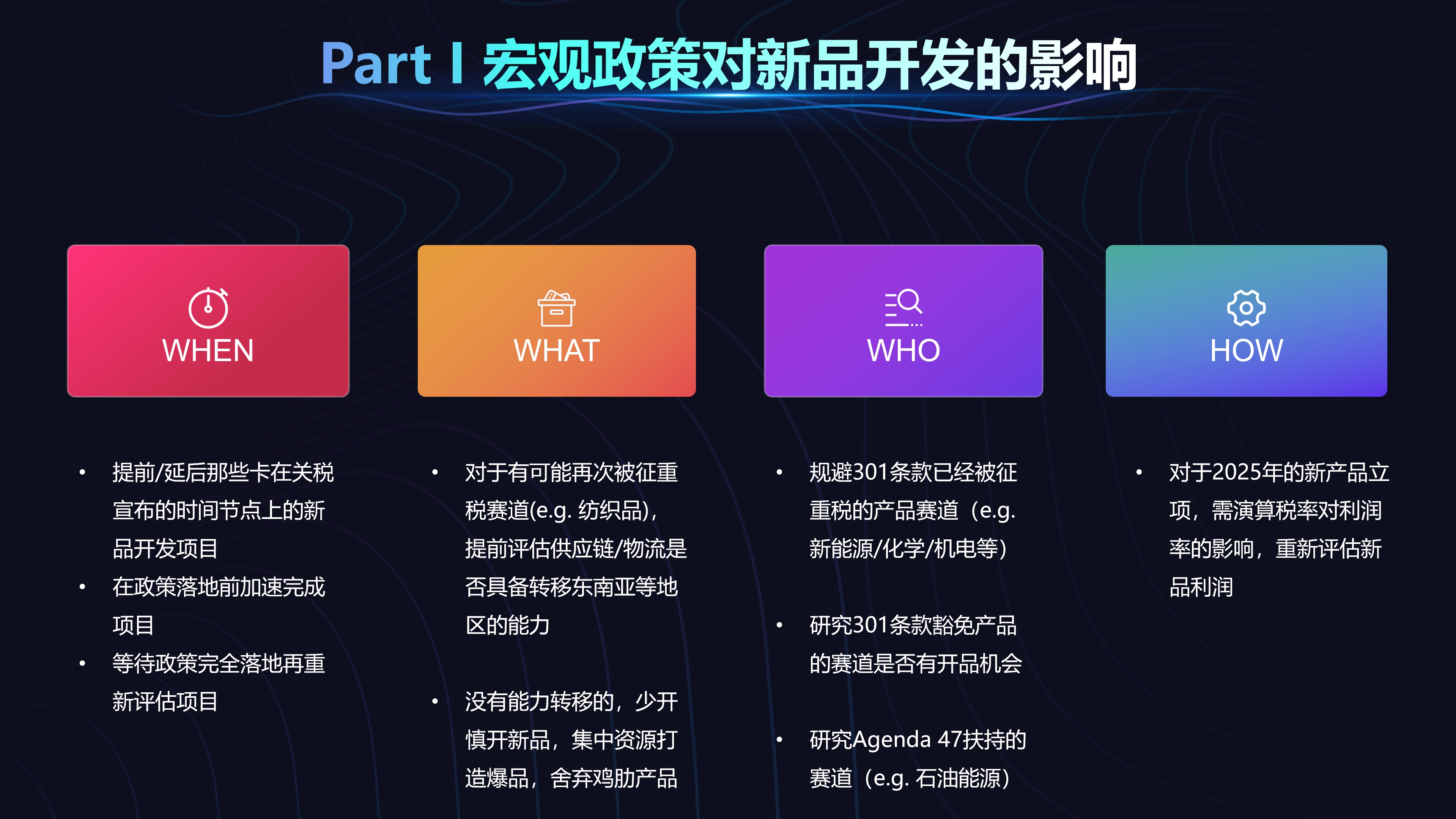 - 从时间来看,对于卡在加税时间节点上的产品开发流程,我们需要提前或者延后进度,防止加税对产品开发的冲击。