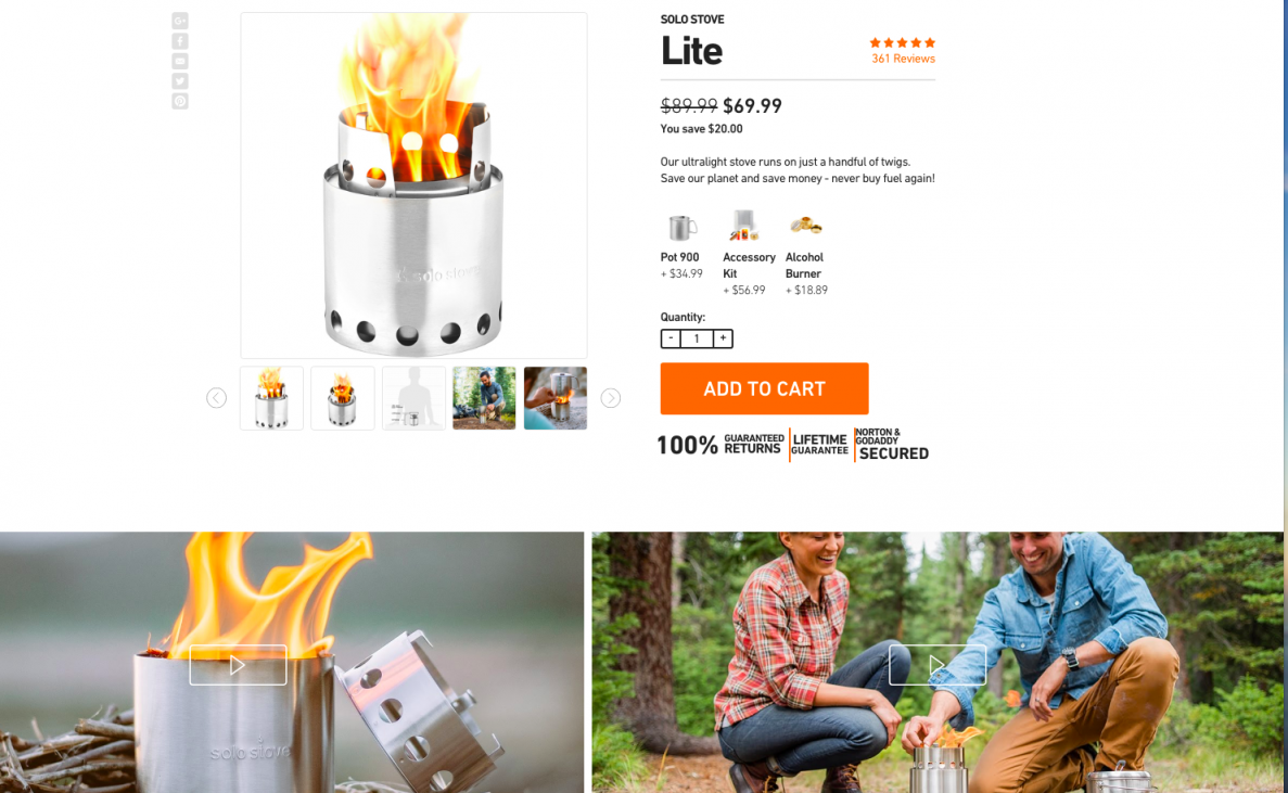比方说Solo Stove这个品牌下的其中一个商品,你可以看到产品页面他们使用了多张图片展示其使用时的样子,主图大小的人体实际比例尺、影片,以及用图示强调它的产品特性。