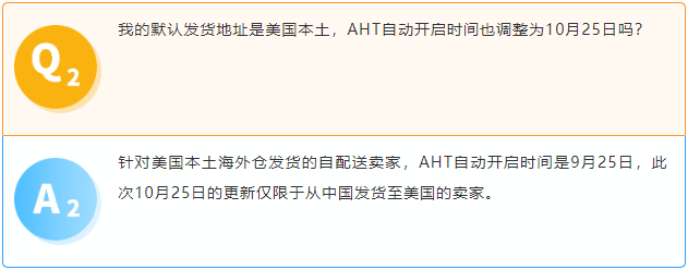 (2)针对美国本土海外仓发货的自配送卖家,AHT自动开启时间是9月25日,此次10月25日的更新适用于从中国发货至美国的卖家。