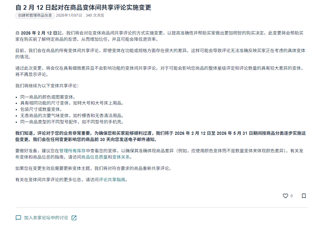 亚马逊(Amazon)近日发布重磅政策更新,宣布自2026年2月12日起,平台将收紧商品评论的共享规则。未来,只有当商品变体(Variants)之间存在细微差异,且这些差异不影响商...