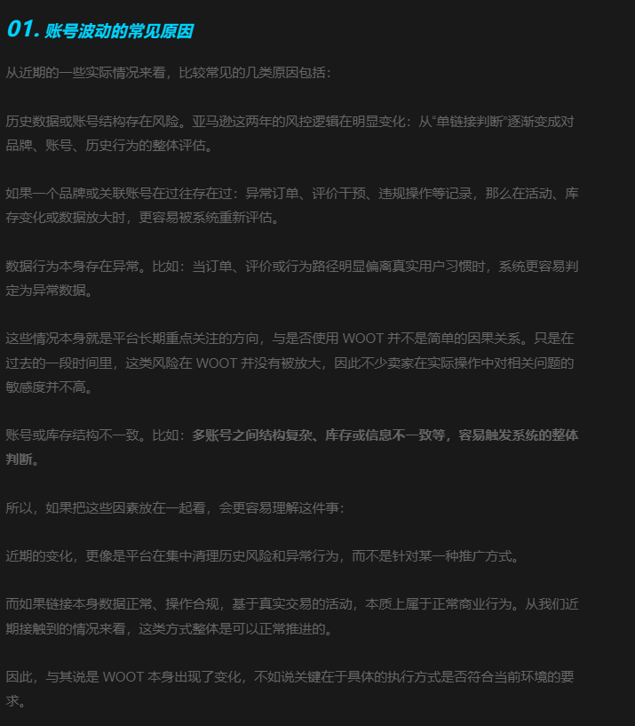 最近一段时间卖家圈里关于WOOT的讨论明显变多了。有人在群里发封号截图,有人讲述损失惨重的案例,甚至有些故事被一遍遍转发,慢慢地,市场上开始出现一种声音:WOOT不安全了?WOOT没权重了? 一、账号波动的真实原因 1.历史数据或账号结构存在风险: 如果一个...