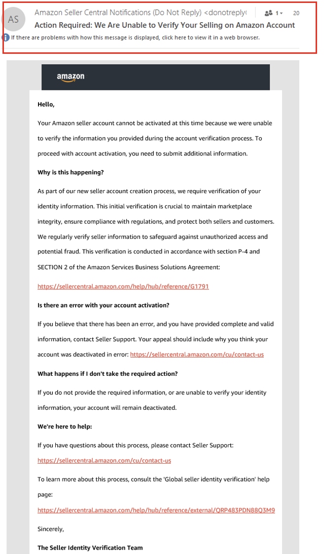 在您提交资质审核之后,如收到如下标题及内容的邮件:邮件标题为《需操作:我们无法验证您的“我要开店”账户》/《Action Required: We Are Unable to Verify Your Selling on Amazon Account》,则表示您的资质审核未通过。请注意邮件后缀为@amazon.com, 谨防钓鱼邮件。