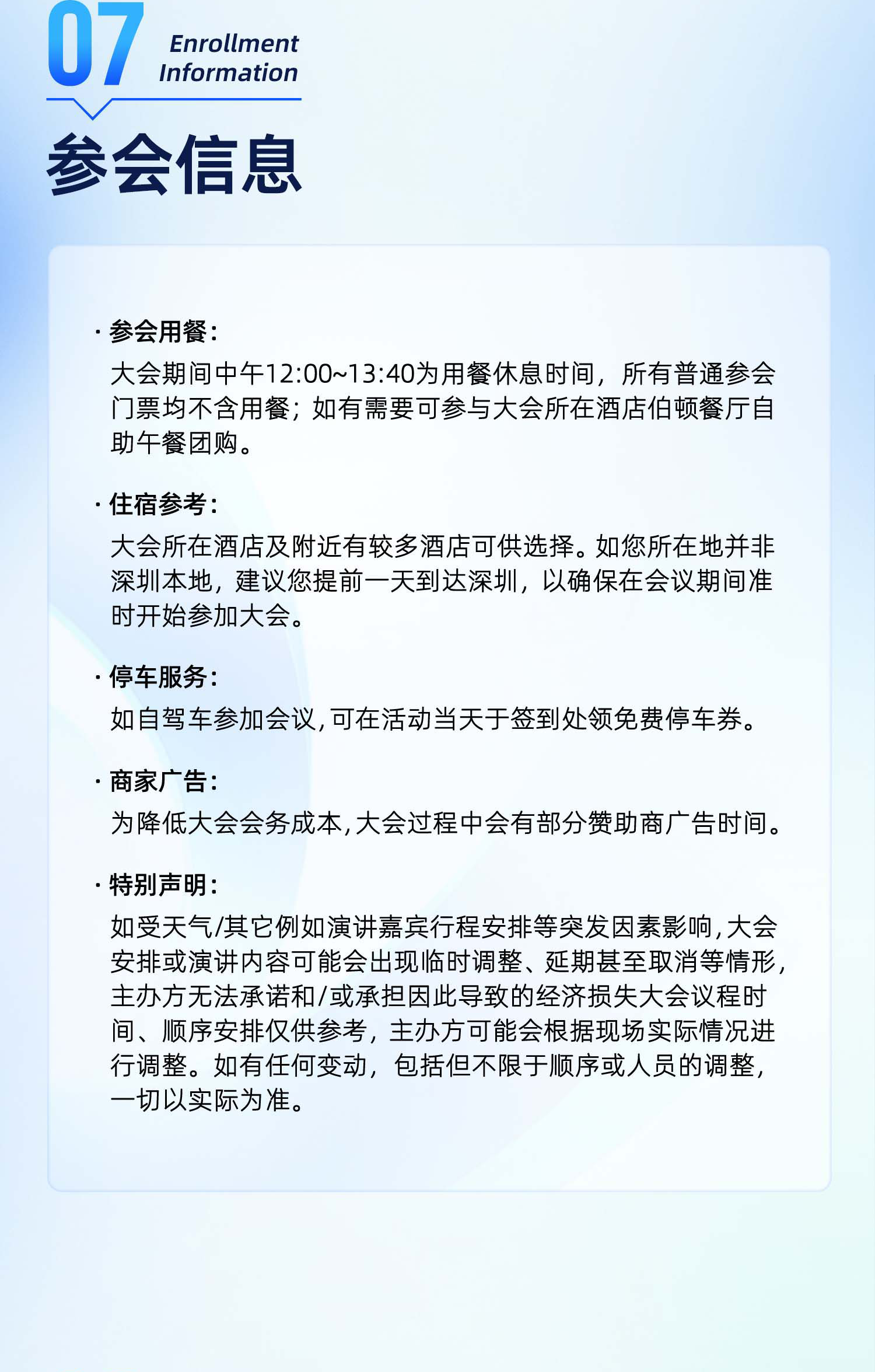 所有参会人员务请自行注意交通出行安全,并需严格禁止醉驾、违反交通安全等不良情形。大会场内人员较多,暂无法一对一安排固定的座位,敬请特别注意个人财物安全,离开座位时物品随身携带,以避免物品遗失或物品损坏。