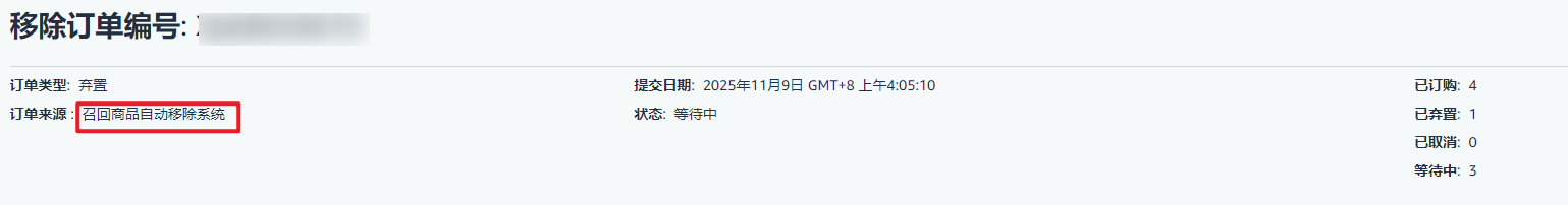 但是2025.10.09我又收到一封涉及另一个asin的移除通知,并且11.09又再次发了通知会被移除,我刚查看移除订单,确实有一个在11.09产生的移除原因为 订单来源 :召回商品自动移除系统,一共是只移除了4个库存。我这个asin有100+的库存。12.03查证的。目前我也在开case向客服查证。