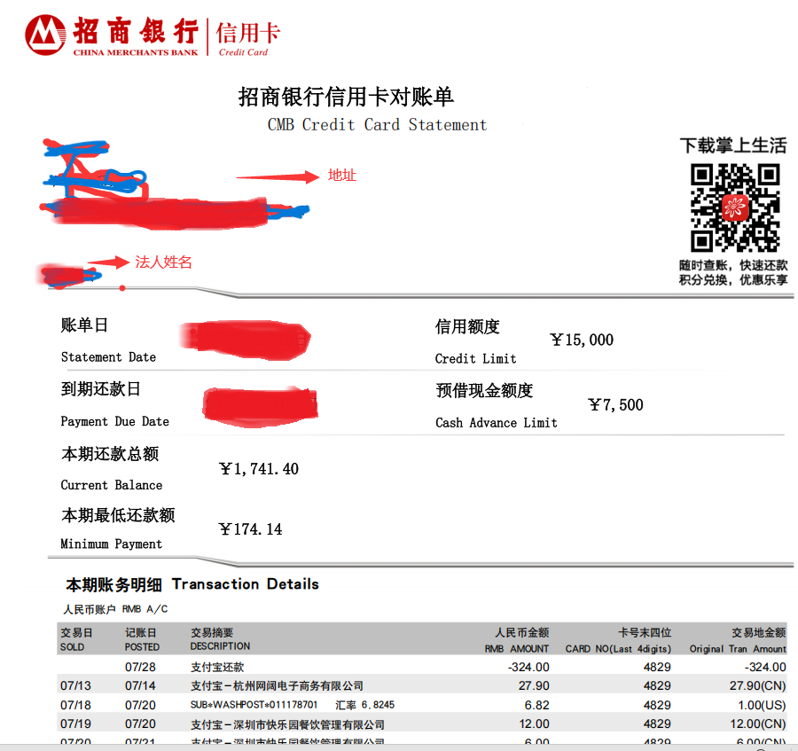 2) 信用卡账单:需要保证账单地址与后台的一致,电子版和纸质扫描版都可以。招商银行账单如下所示: