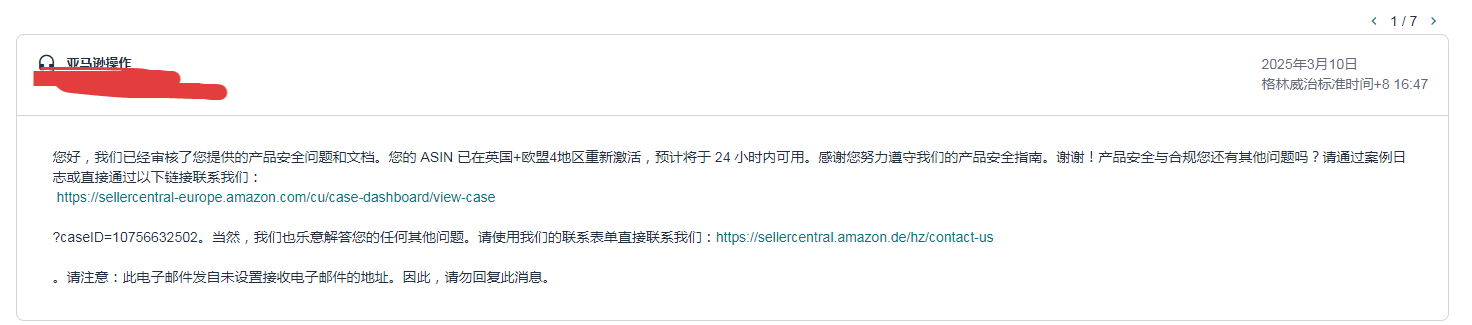 然后是你如果在七天之内回复了亚马逊,然后亚马逊大概率不会召回你的产品,按照亚马逊的要求提交资料,通过了链接就回来了。