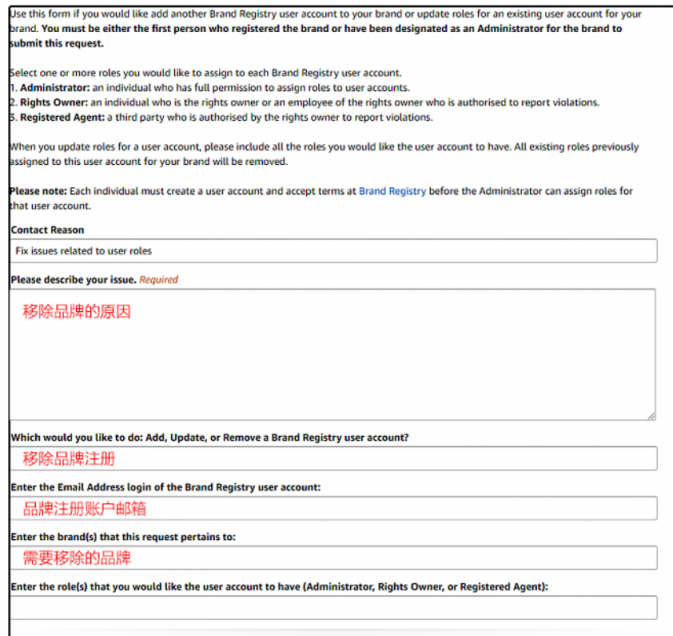 ④选择“remove”并填写移除品牌的原因及需要移除品牌的信息;