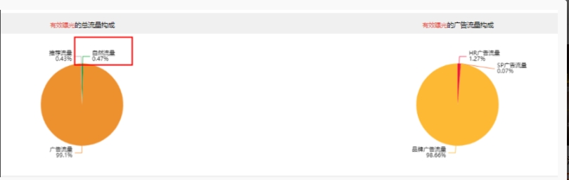 给你看我之前操盘的一个广告的的流量架构,我的思路就是用广告拓流测试,不追求自然排名(不侧重SP打词)左边图自然流量仅占比0.47%,右边图品牌广告流量高达98%+。这个产品流量词确实很多,但是自然流量词排名不够靠前,非常依赖广告流量。可以说我一关广告,销量波动就比较大。