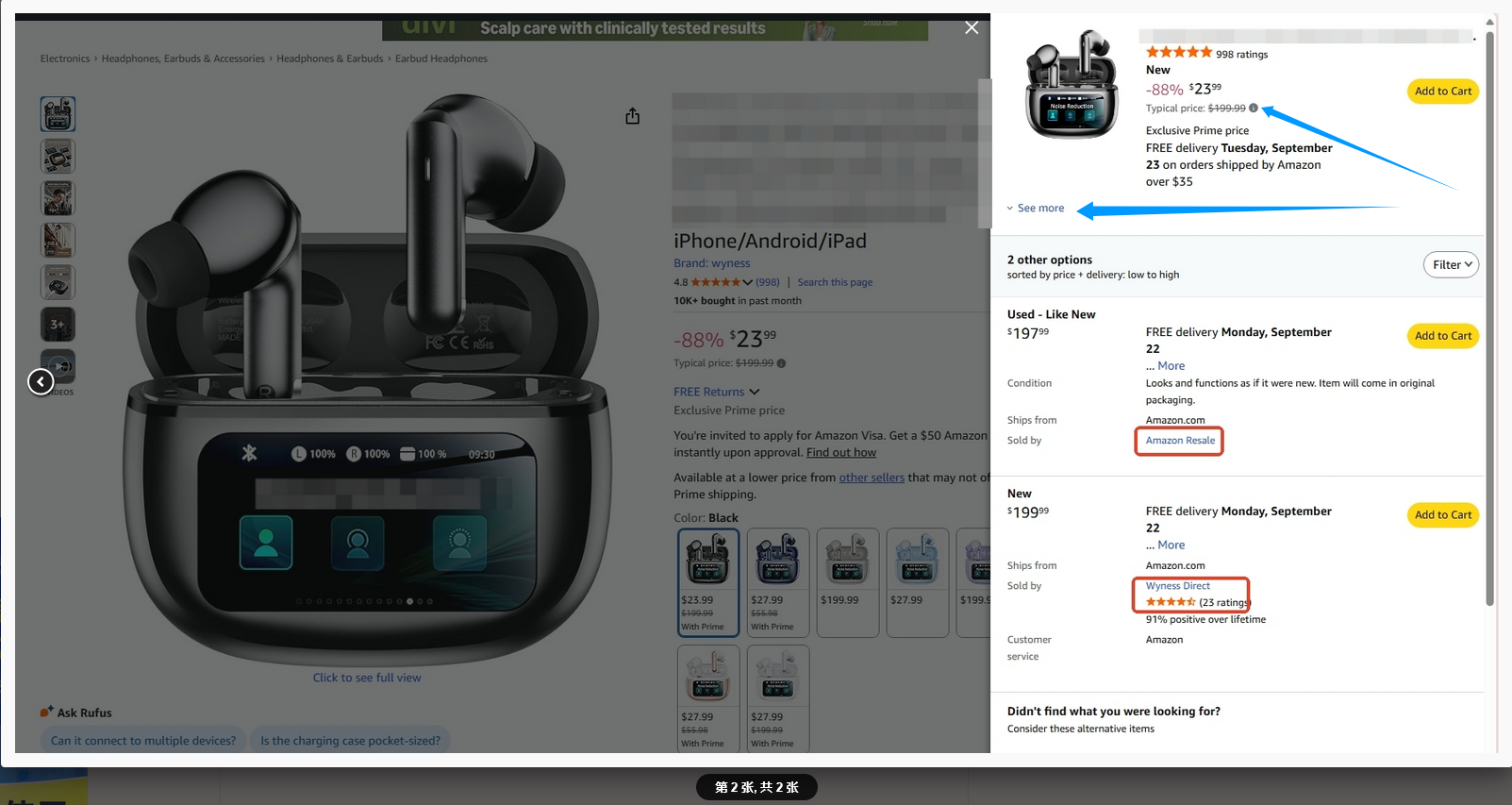 第二个问题,“其它报价那里只显示亚马逊二手和Wyness Direct这两个报价,并没有Wyness Tech Store的原价”,这个原价应该是隐藏在你第二张图片的上方 第一条链接的“See more”那里,会展示店铺名,同时再上面一点已经显示了划线原价199.99