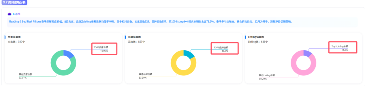 在【 市场分析 】板块中,可以从‘类目销量趋势’、‘类目头部年度销量’、‘类目关键词竞争’、和‘类目垄断’的AI总结中,判断市场的饱和度、健康度,是否是处于正向扩容阶段,以及头部卖家是自然流量稳固型还是品牌站外堆砌型。