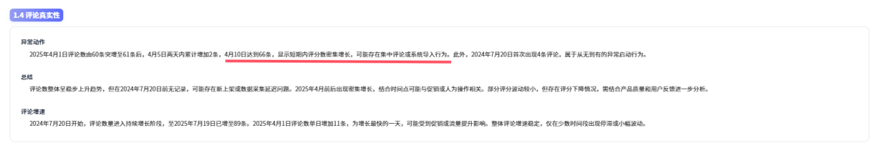 在【 产品分析 】板块中,‘产品成绩’和‘评论真实性’两项都记录了竞品上架以来的销量和评论波动情况,如有异常,AI将会自动检测并推测异常原因。