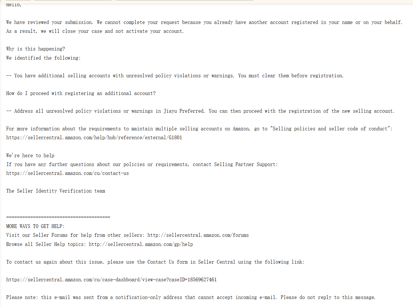 关于第二次申请注册开店,从而导致亚马逊发现另一个以我的名义或代表注册了账号的问题申诉