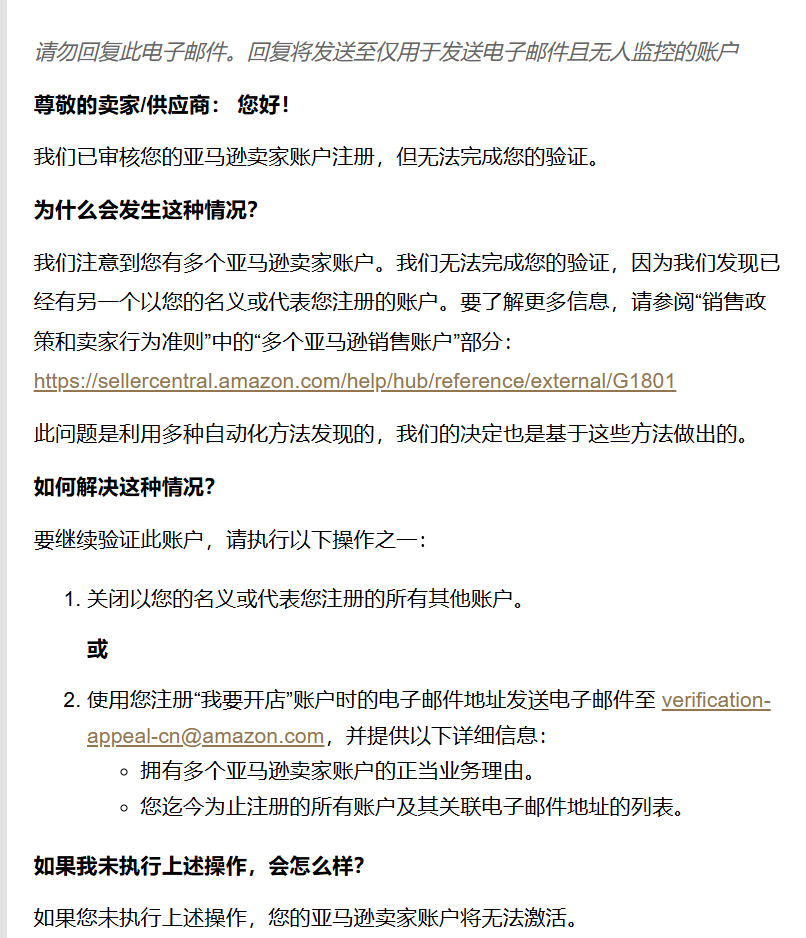 但是等了一个多月,服务商那边没消息,进度也不说反正就是等! 实在等不了了就重新找了一个服务商,说是能解决可以下店。我也信了。 就交给新的服务商弄,要我进行第二次注册,换了电话和邮箱。结果回复的是“无法完成我的验证,因为亚马逊发现另一个以我的名义或代表注册了账号”