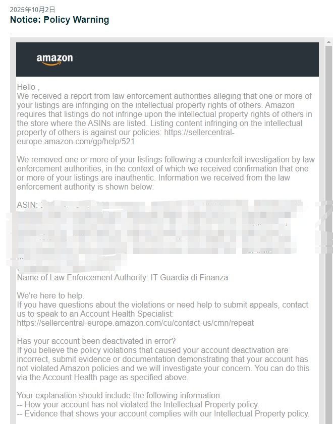 亚马逊 LSITING 被欧洲意大利 IT Guardia di Finanza 执法部门投诉下架,我查了下是属于意大利财税警察部门,有小伙伴遇到此类情况吗? 确定产品不侵权,也不擦边