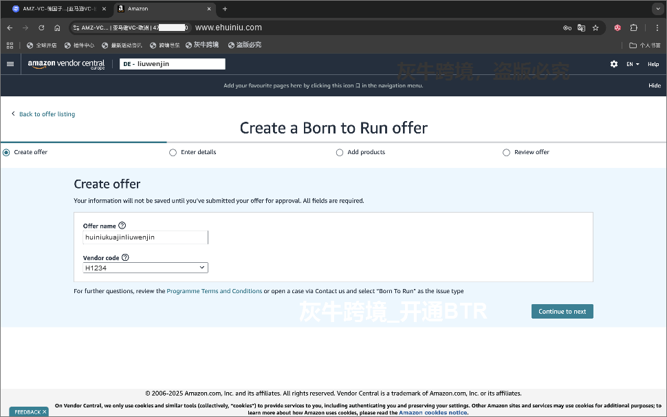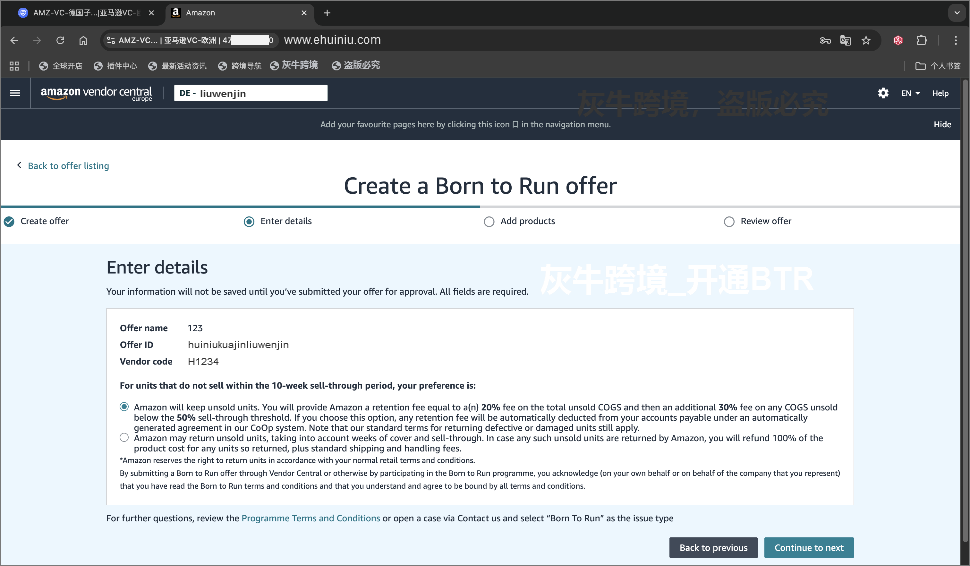 3.4. 进入Create a Born to Run offer页面,填写订单自定义名称,勾选Vendor code,点击 Continue to next,进入“Enter details”页面