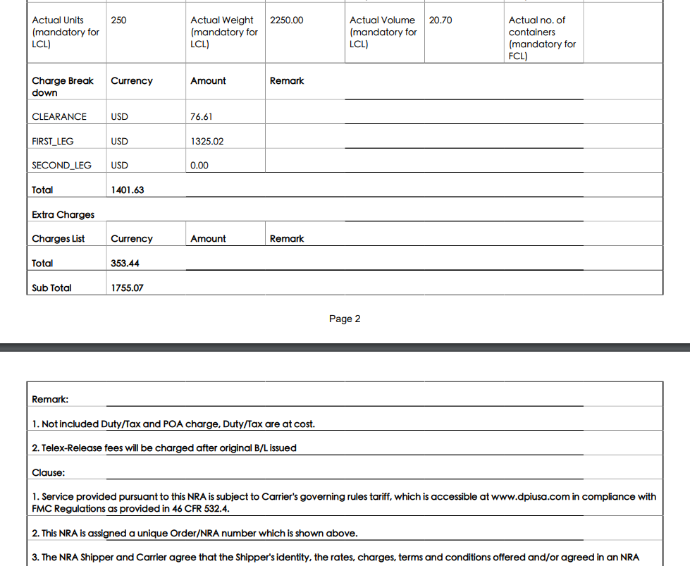 2)货物即将到达港口时,收到了确认“海关税单”(NEGOTIATED RATE ARRANGEMENT(NRA))的邮件通知,是在后台货件里面确认的。请问,能帮忙解读这个账单吗?看不太懂..... 这个账单是包含了运费和税费?