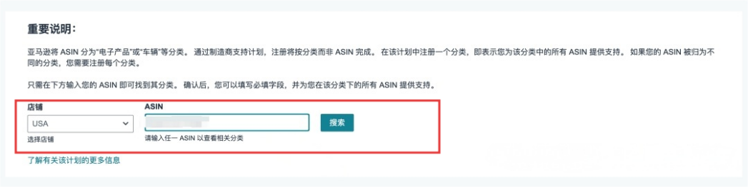 选择对应的目标站点并填入要提供支持的ASIN信息,搜索后找到对应商品的“管理”入口,进入后续配置页面。
