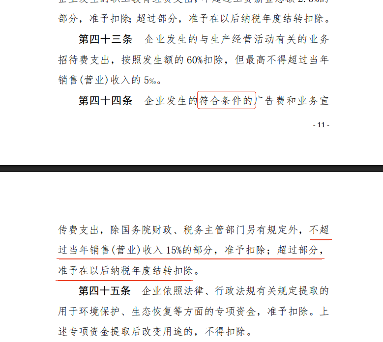 企业发生的符合条件的广告费和业务宣传费支出,除国务院财政、税务主管部门另有规定外,不超 过当年销售(营业)收入 15%的部分,准予扣除;超过部分, 准予在以后纳税年度结转扣除。