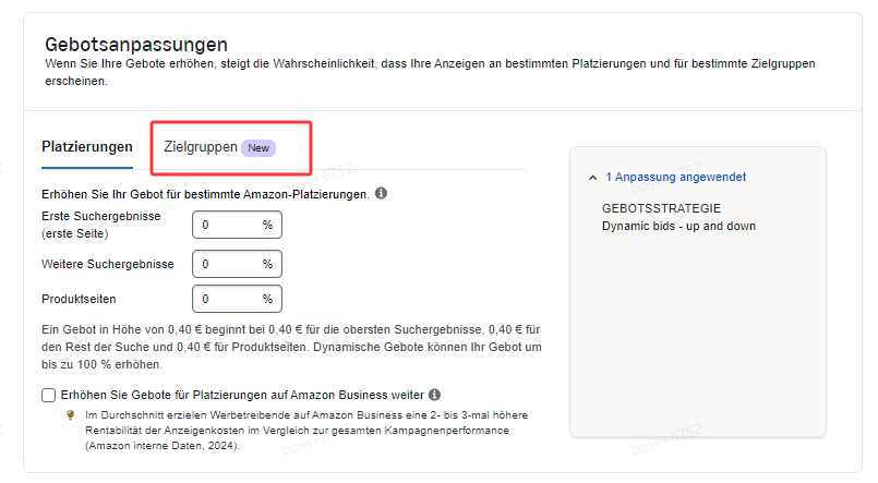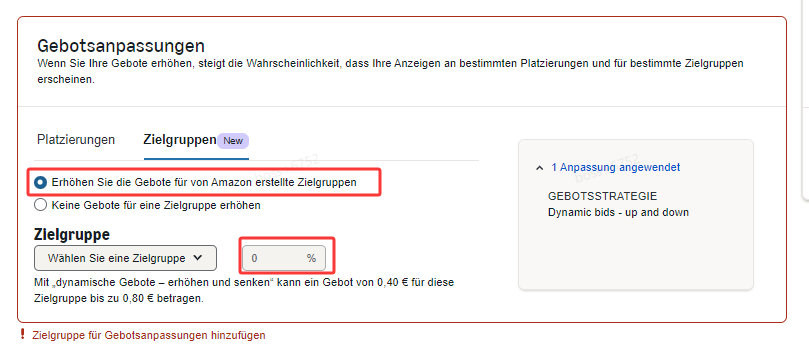 我试了几次我后台语言默认德语,但是我明明改成英文了,你们将就看看吧,这个板块就是我们创建SP广告的时候,你是不是要对广告位进行额外加价的板块,旁边有一个目标人群,这个就是我前面说的AMC人群