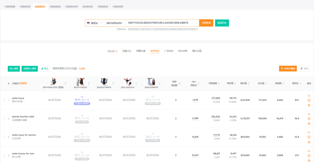 因为在广告投放过程中,除了关注广告流量本身,自然流量来源的监测同样关键。举一个“kids ankle brace”(儿童护踝)关键词的例子,具体的数据在下面的截图:假设我的产品尺寸也适配儿童,那从对比情况来看,竞品们在该词下均已获得前三的自然流量;反观我们自身,此关键词的自然流量排名未进前三,不过它的购买转化率表现还不错。所以经过对比之后,我们可以将该词纳入广告投放,现在这个阶段可以,未来成熟期阶段更可以。