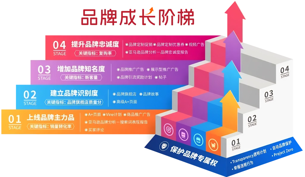 结合亚马逊品牌成长阶梯与官方品牌工具,可以通过以下四个阶段动态运营系统性打造品牌。
