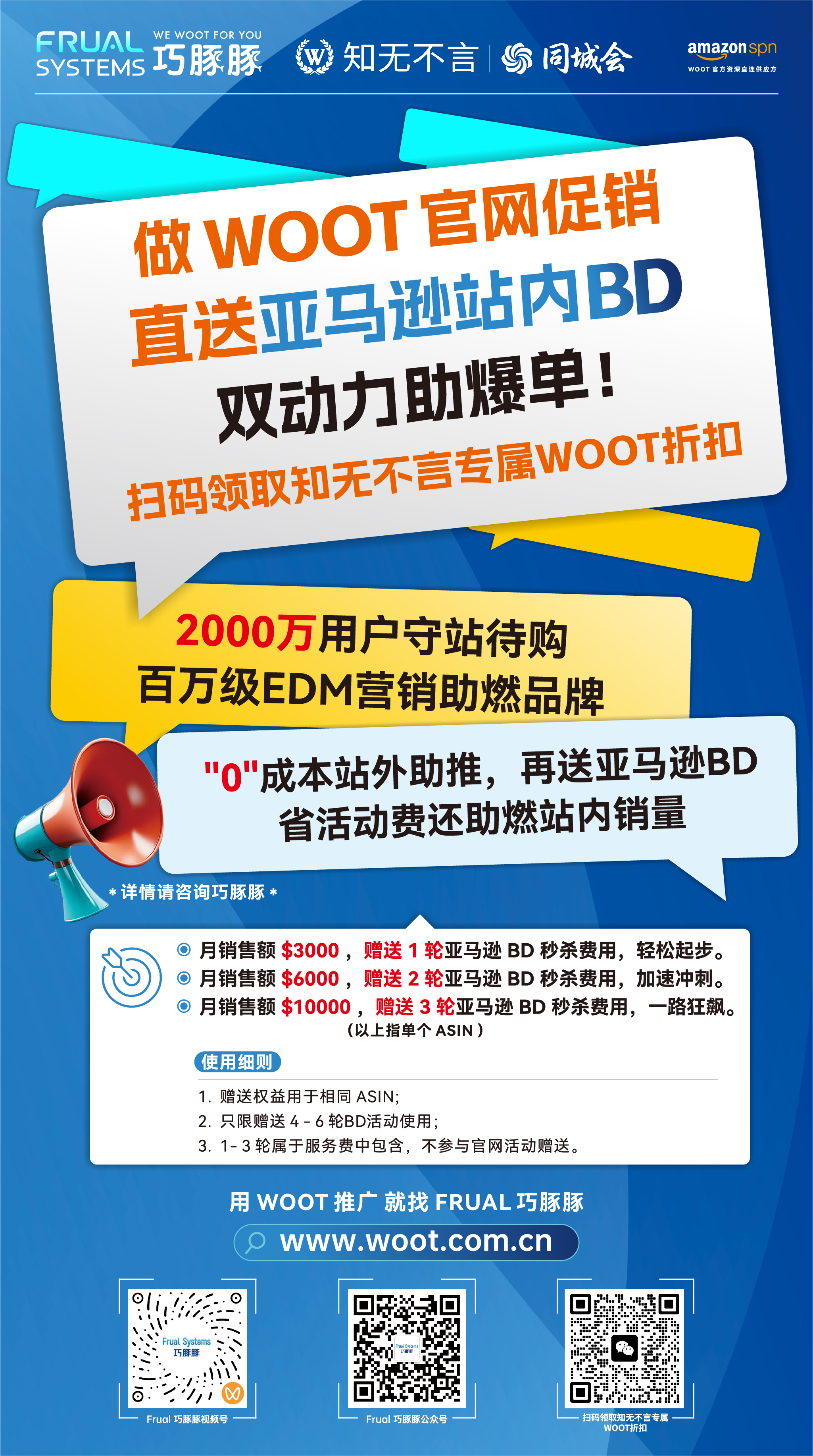 黑五网一临近,亚马逊卖家该如何使用 WOOT 拉动销量、提升排名?扫描下方二维码领取知无不言专属 WOOT 超低折扣,直送亚马逊站内BD,双动力助爆单!
