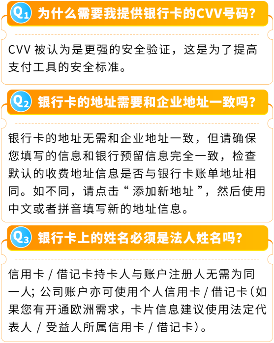 (3)在注册完成后及账户运营过程中,您可随时更换信用卡/借记卡信息,但频繁更改可能会触发账户审核,亚马逊建议您在更换前咨询卖家支持。