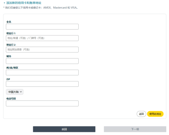 (3)检查默认地址信息是否与信用卡/借记卡账单信息相同,如不同,请点击“添加新地址”,然后使用中文或拼音填写新的地址信息。