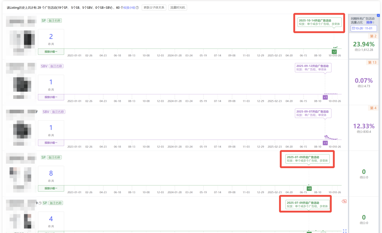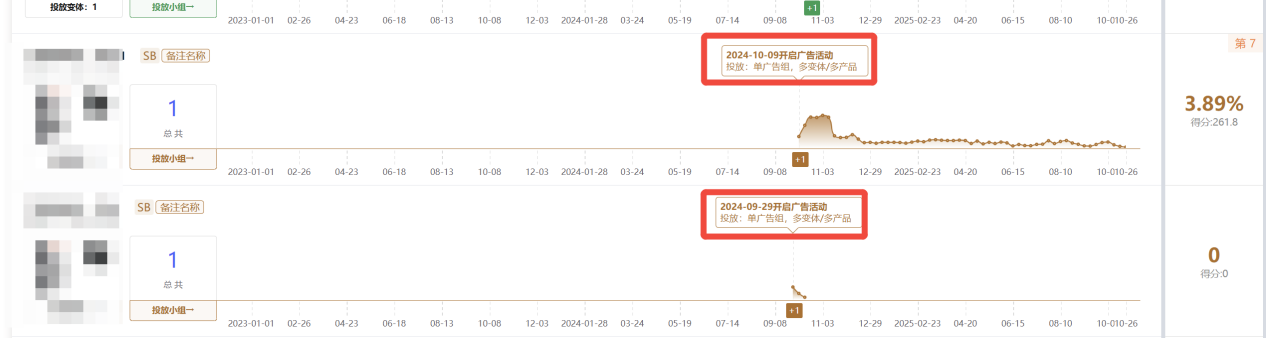 通过插件可以清晰看到时间节点下开了单/多变体广告,再结合插件记录当时日期的广告排名和自然排名变化情况,显然是能够产生联系的。所以通过广告结构溯源,我总结以下几点或许能够加强多变体自然排名的广告打法:(广告类型还是原来的类型,但是我引入了一些近期的COSMO算法和AMC云数据,使得打法更加完善和精准)