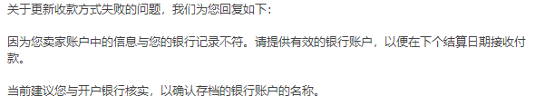 每次都验证0.01失败。提示内容是卖家信息和银行信息不一致。持卡人姓名试过法人名字拼音,公司名称拼音(跟后台店铺信息一致)。