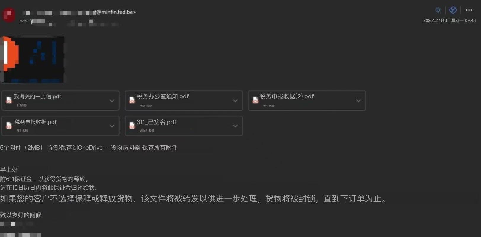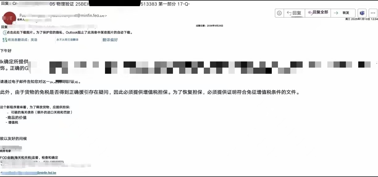 我们的货代发给我们一张截图,说是荷兰海关发给他们清关行的,邮件说,清关编码不正常,为了释放货物,需要缴纳一定的保证金。之后货代让我们写个解释和承认错误的文件打印出来盖章扫描成图片发给清关行,让清关行回复给海关,承认海关认定的新的清关编码,然后询问为什么要缴纳保证金。