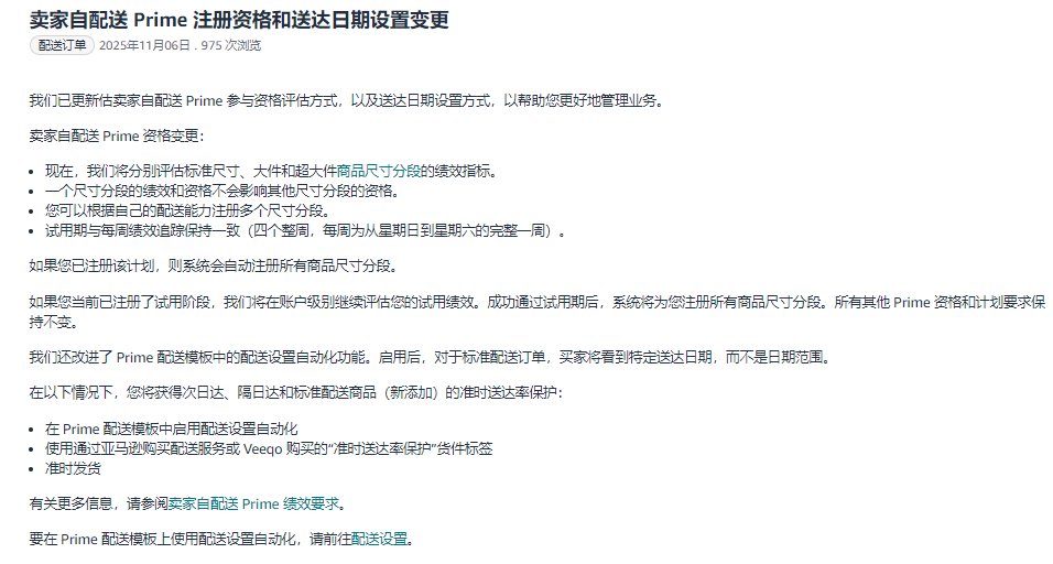 亚马逊官方发布 卖家自配送 Prime 注册资格和送达日期设置变更!