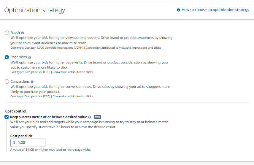优化方案,分为三个选项,本质上是你告诉亚马逊这次广告活动的主要目的是什么,系统会根据你的选择来优化投放。