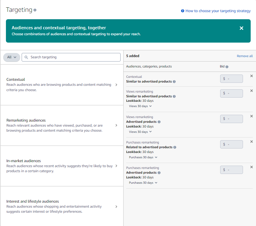根据经验,SD广告的点击出价通常可以设置得比SP广告低不少,很多类目中可以低至SP出价的50%左右,建议可以从这个比例开始测试。