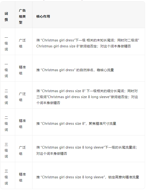 核心是通过「分级建组 逆向层层否定」,让一级 / 二级 / 三级词的广泛组各司其职,分别挖掘本级专属的长尾流量,筛选出高点击、高转化的优质词,为 “推词” 储备 “弹药”(比如从广泛组筛出的 “8 码长袖圣诞女孩裙 红色”)。