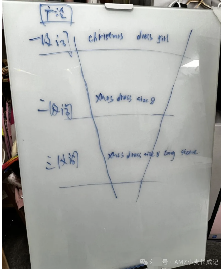 • 这样一来,一级词的广泛组就能心无旁骛地去探索更泛的、我们尚未发现的流量,比如 Christmas party dress for girl 等,而不会重复筛到二级,三级词的次级及次次级流量词,从而真正发挥“漏洞”的作用和价值。