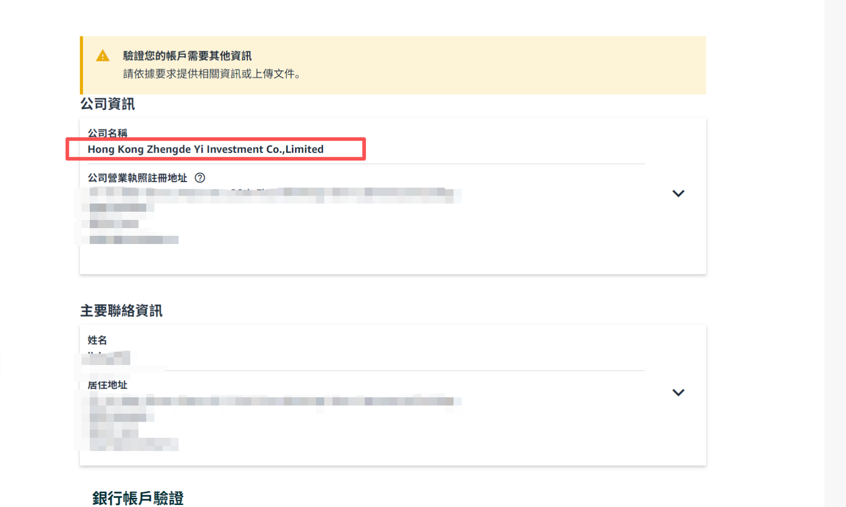 3、目前已显示银行账户验证是验证该错误公司名
