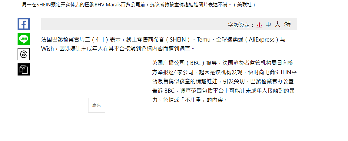 起因:法国监管部门调查发现希音法国站点上200多见抽样有160多件不符合欧盟法规要求,且平台上存在武器,儿童性玩偶等违规商品。
