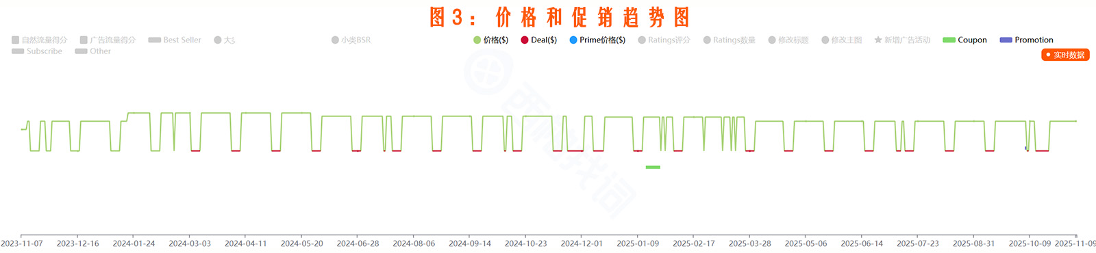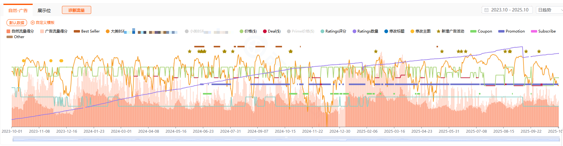 1.看紫色的Rating数量线,如图1:将时间线再往前拉一点,很明显这个链接的评论数量符合一个正常增长的曲线,前期没有一下子的高峰或者低谷,前半段没有合并到老链接蹭父体评论等,25年2月有略微下降,当时我是有关注过的,是将这个链接中的种子链接拆分出去给别的链接用了,然后9月也出现一个下降,有可能是是被系统拆分了或者人为拆分的。(主推Asin的评论是否是正常的线性增长,考虑采用白帽送测VINE/备用的种子链接/老链接可合并的方式,评论影响到转化时的补救措施节点)