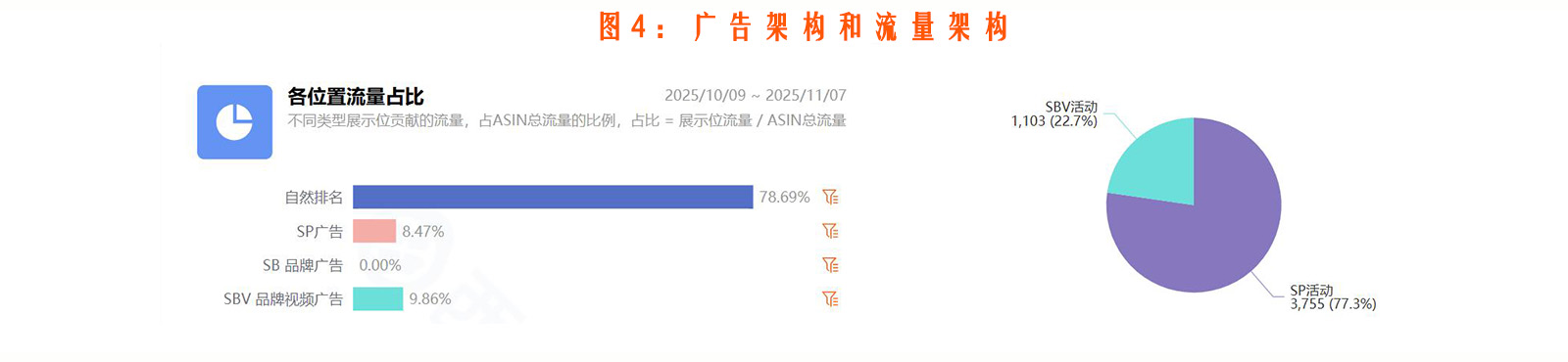 4.看它的广告架构和流量架构以及流量来源,如图4:判断对方目前广告流量的占比,可以一方面来验证对方现在的广告策略,如果自然排名都已经靠前,广告的占比不大,说明该产品进入稳定盈利期。如果有SB/SBV广告说明在做流量防御/单量补充/SBV的转化效果较好。(掌握对方的流量来源和架构,判断对方的推广阶段和策略)