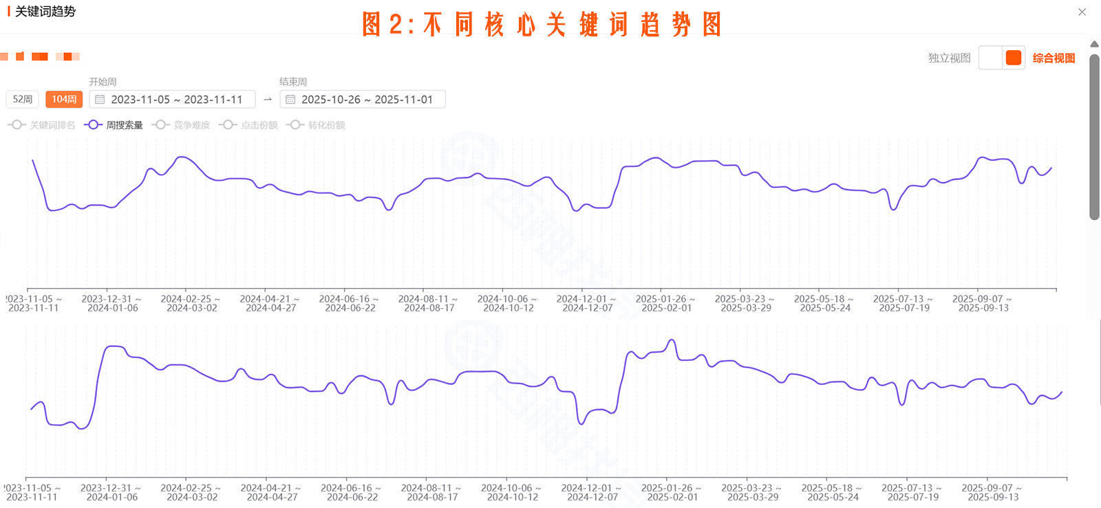 2.看流量得分趋势图,如图2:自然流量的高峰期和广告流量高峰期保持一致,低谷期亦是如此。而且很明显广告在1-3月之间是全年最高峰。于是我反查了一下几个核心关键词,1-3月处于流量的高峰,4-8月处于流量的低谷。到这里:两个图相互验证。我已经掌握了:核心关键词的趋势和该产品的流量趋势图大体上是保持一致的,没有明显的季节性属性,但是在1-3月是一年中的高峰,该产品市场容量整体呈现上涨趋势。(抓好产品的市场趋势和增长节点,顺着趋势推广新品,尤其是季节性产品,把握好库存层面的到货/补货节点)