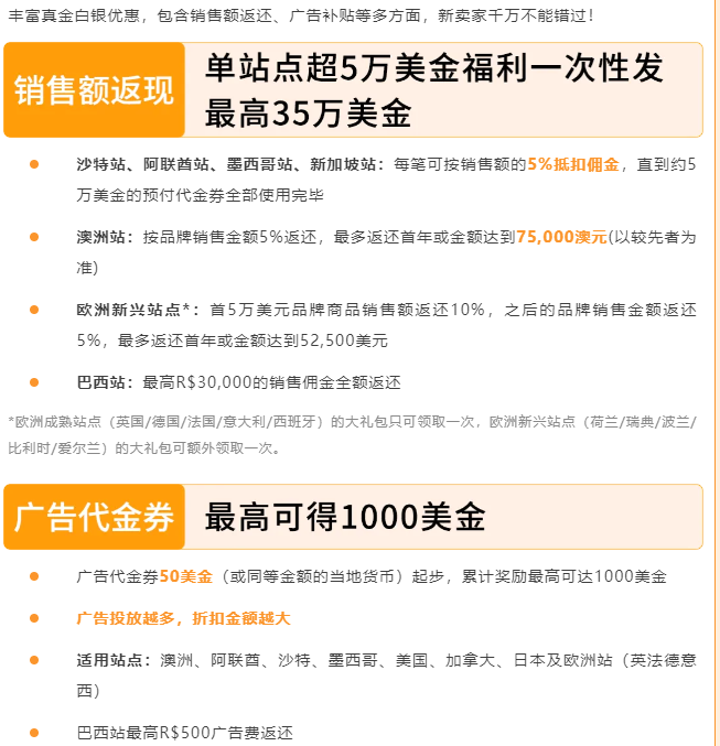 在一定时间内,符合要求的新父ASIN前100件(大件50件)商品获得销售佣金减免,降至5%。个别站点还有免仓储费、免库存移除费等其他福利。