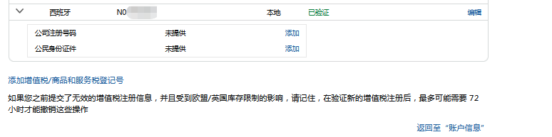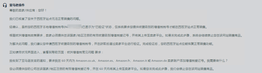 求助!!!问题是这样的:店铺西班牙站点很早之前让提交VAT,没有提交就停用了,因为我们一直只做德国,所以也没啥影响,最近想开通泛欧发现必须激活西班牙站点,结果发现激活西班牙需要的是欧盟税号,我们提交的本地税号没用?注册欧盟税号又需要西班牙出B2B订单到其他国家,现在西班牙没激活链接都上不去是无法产生订单的!这岂不是就无解了吗。联系了无数次的亚马逊和税务代理都没有具体的解决方案。