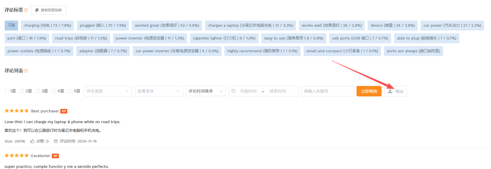 3. 按星级(1-5 星)、评论类型、时间降序等条件筛选,还能设置关键词精准定位目标评论,还可以直接导出对手评论详情,进行痛点分析