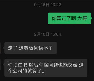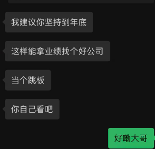 于是公司就变成我一个人负责三个店铺。短期没人,他肯定也不会开除我。然后我想着按照大哥的说法继续坚持到年底,老板把提成方案改了,基本上就是拿不到钱了。再加上招了一个新的主管,虽然对我也不错,但是对于公司已经是心死了,我就选择离职。