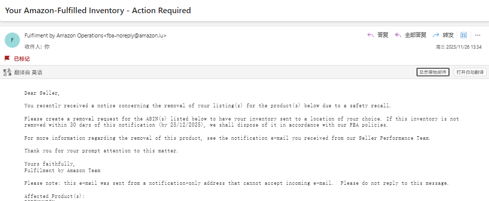 美国链接正常售卖,却收到邮件产品提示要安全召回,30天内要求移除,无绩效通知,无后台case,只有卖家邮箱收到了1封邮件。有人遇到这种问题吗,需要管吗,不管到时候时间到了会不会被移除