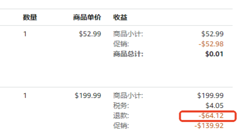 关键原因分析:由于亚马逊的折扣促销金额会进行均摊,产品a在折扣后仅剩0.01。买家还申请了对产品b的退款,因此该订单导致买家以0.01元获得了产品a(等于0元购)。