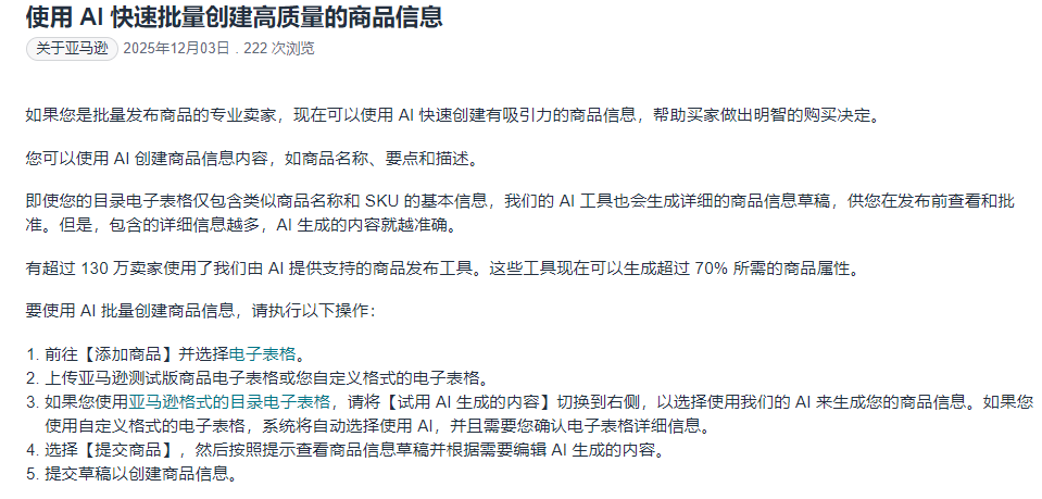 AI在各大行业中快速应用,亚马逊的卖家新闻中推出了AI创建商品信息,大家开始使用了吗?