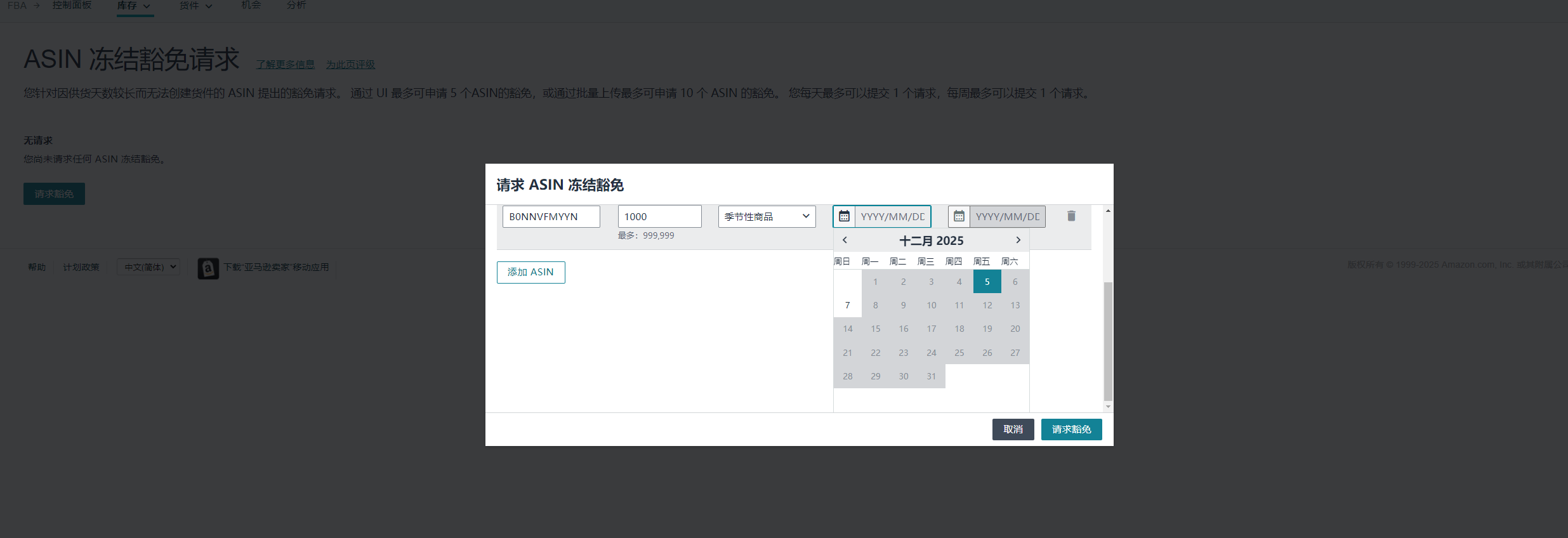 单个产品ASIN被限制FBA补货发货,申请AWD卫星仓的ASIN冻结豁免,日期全部灰色不可选,如何操作?