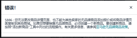 我们发现,您正在尝试向一个之前从未提供过任何信息的受限无品牌 ASIN 提供信息,例如试图更改详情页面、创建或更新报价等。要进行更改操作,例如将此 ASIN 扩展到新商城、创建新的变体关系、更新 ASIN 属性或者添加报价以销售商品,您必须按照我们“添加新商品”工具中列出的流程创建一个新的 ASIN。 有关更多信息,请参阅“亚马逊无品牌商品政策”: